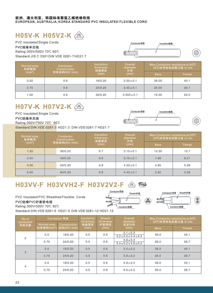EUROPEAN AUSTRALIA KOREA STANDARD PVC INSULATED FLEXIBLE CORD H05V-K H05V2-K H07V-K H07V2-K H03VV-F H03VVH2-F H03V2V2-F
